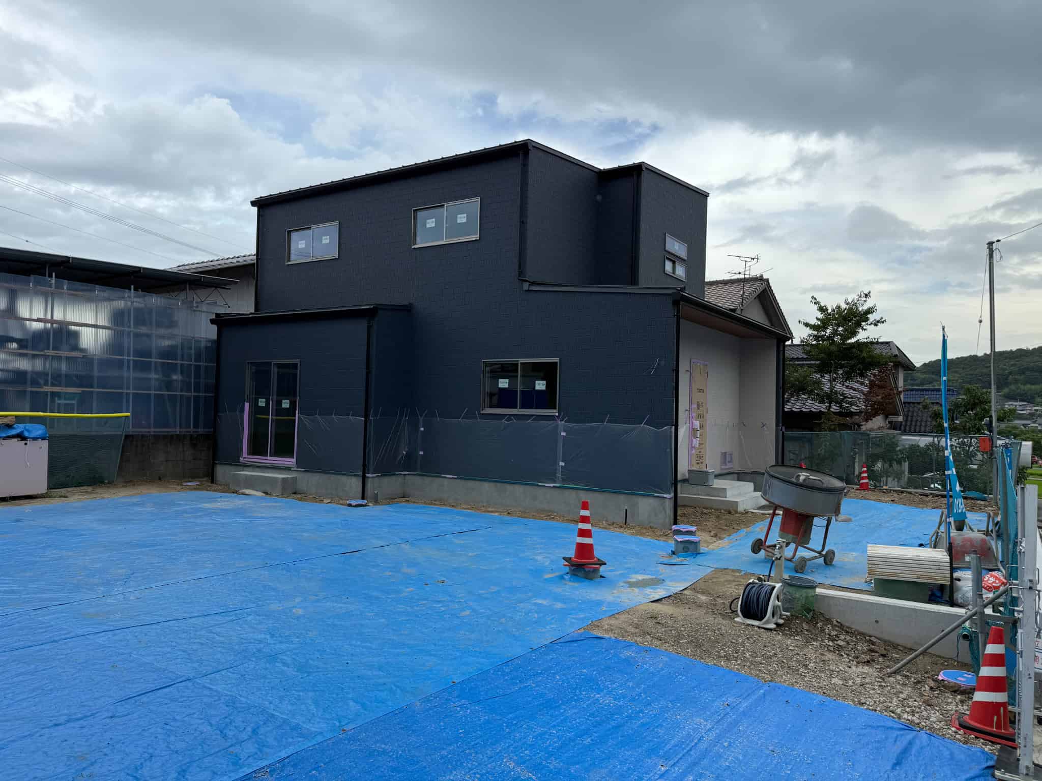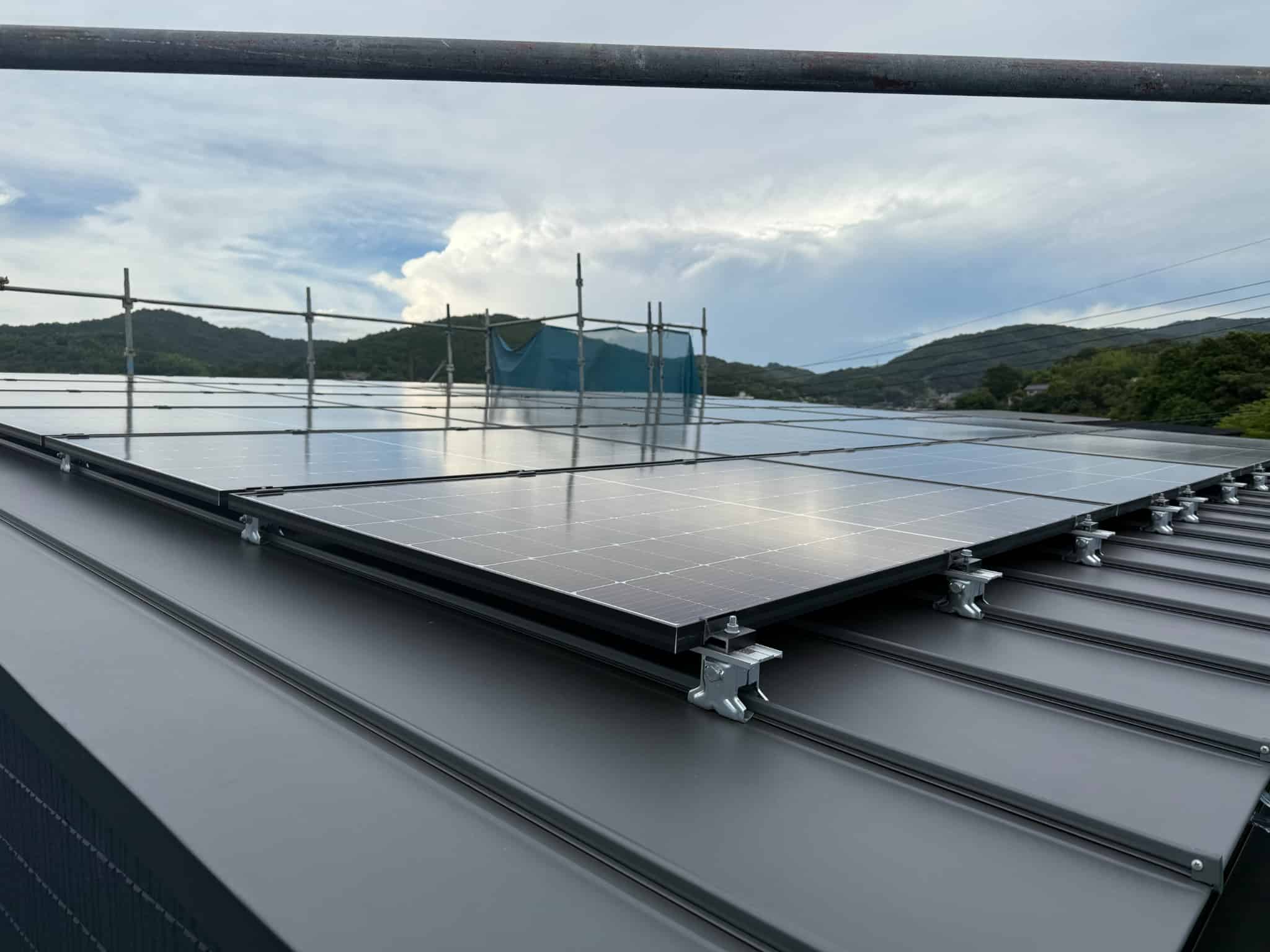外壁を貼りおえ 屋根に太陽光をのせたので